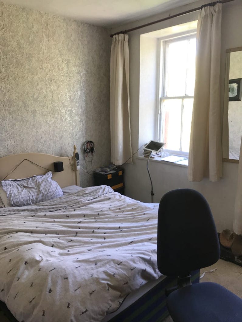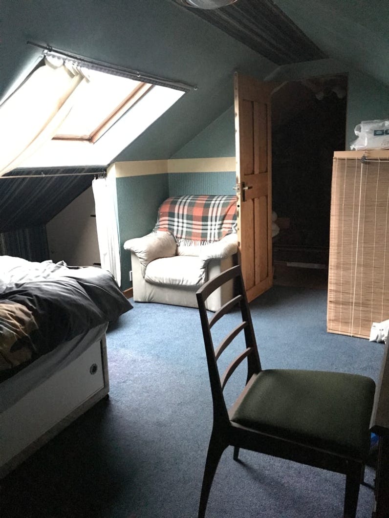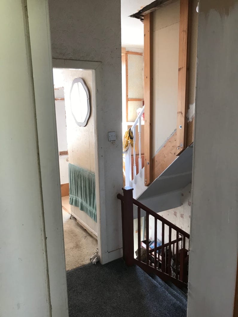 The house next door is on a lower level than the main part of the house, so that only the roof space is attached to our gable end.